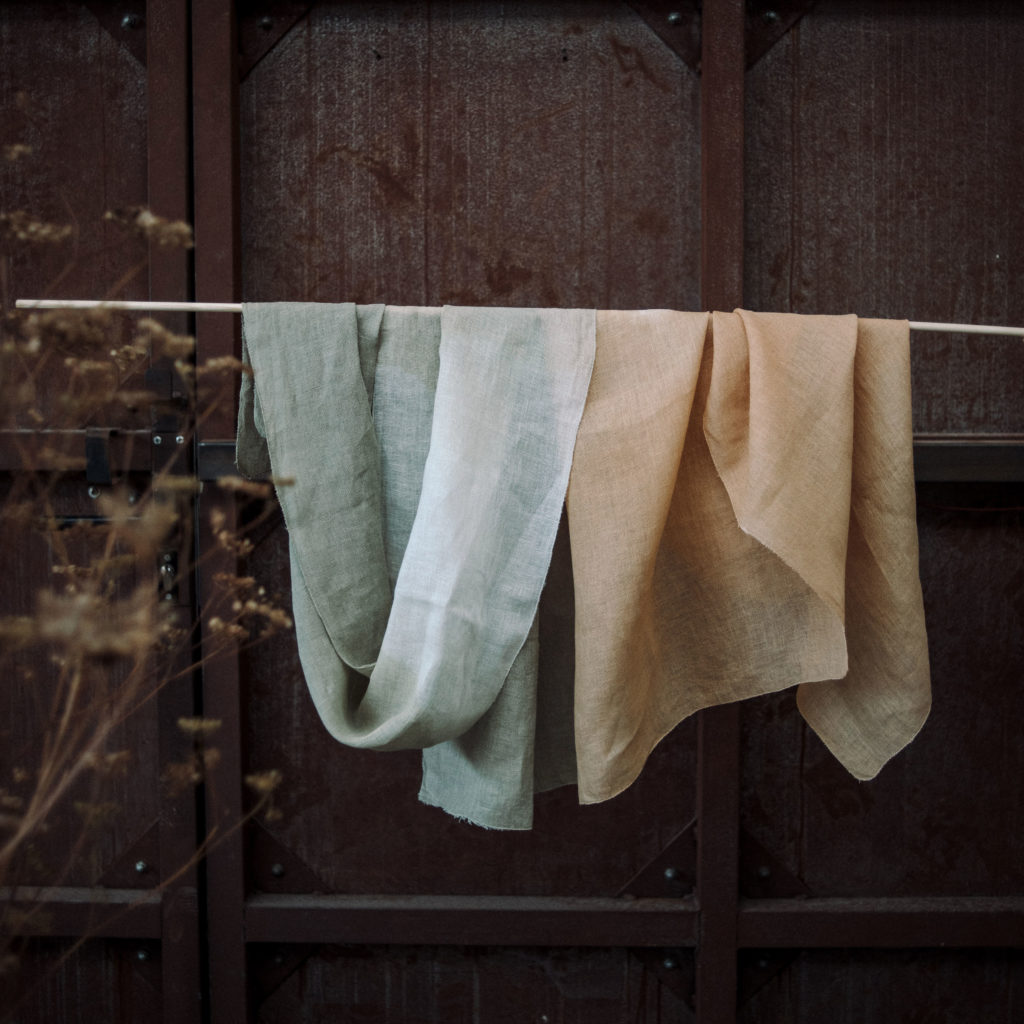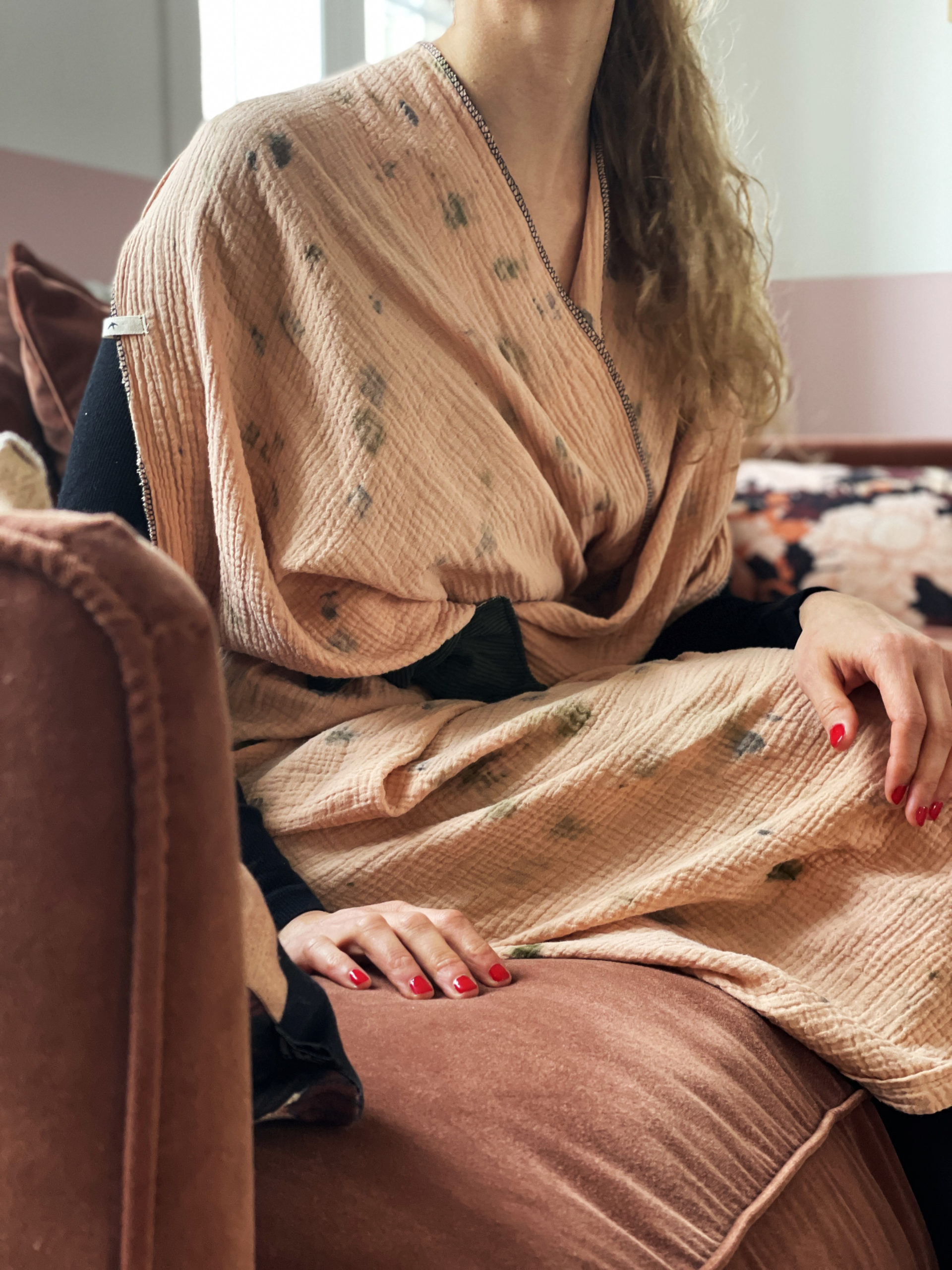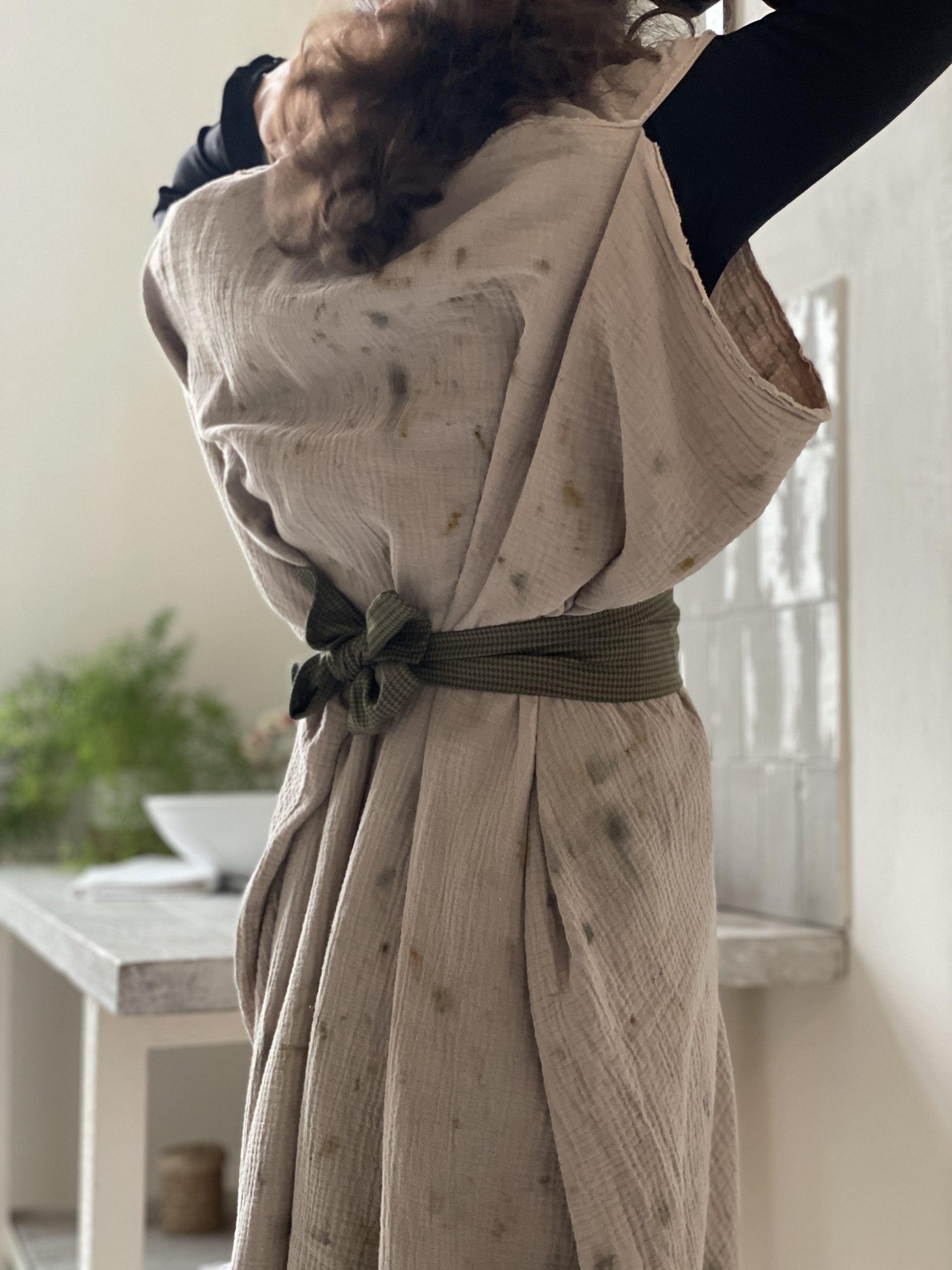 Notre travail commun a débuté par la création de 4 kimonos en teinture végétale me donnant l’opportunité de mettre à profit mon savoir-faire dans le domaine vestimentaire, ce qui était une grande première pour moi.