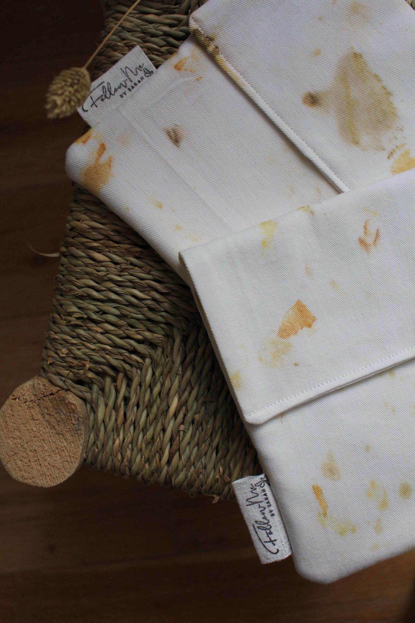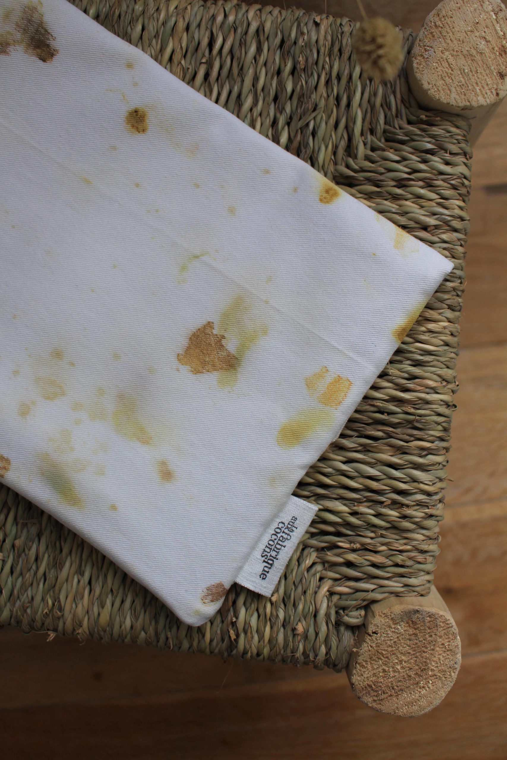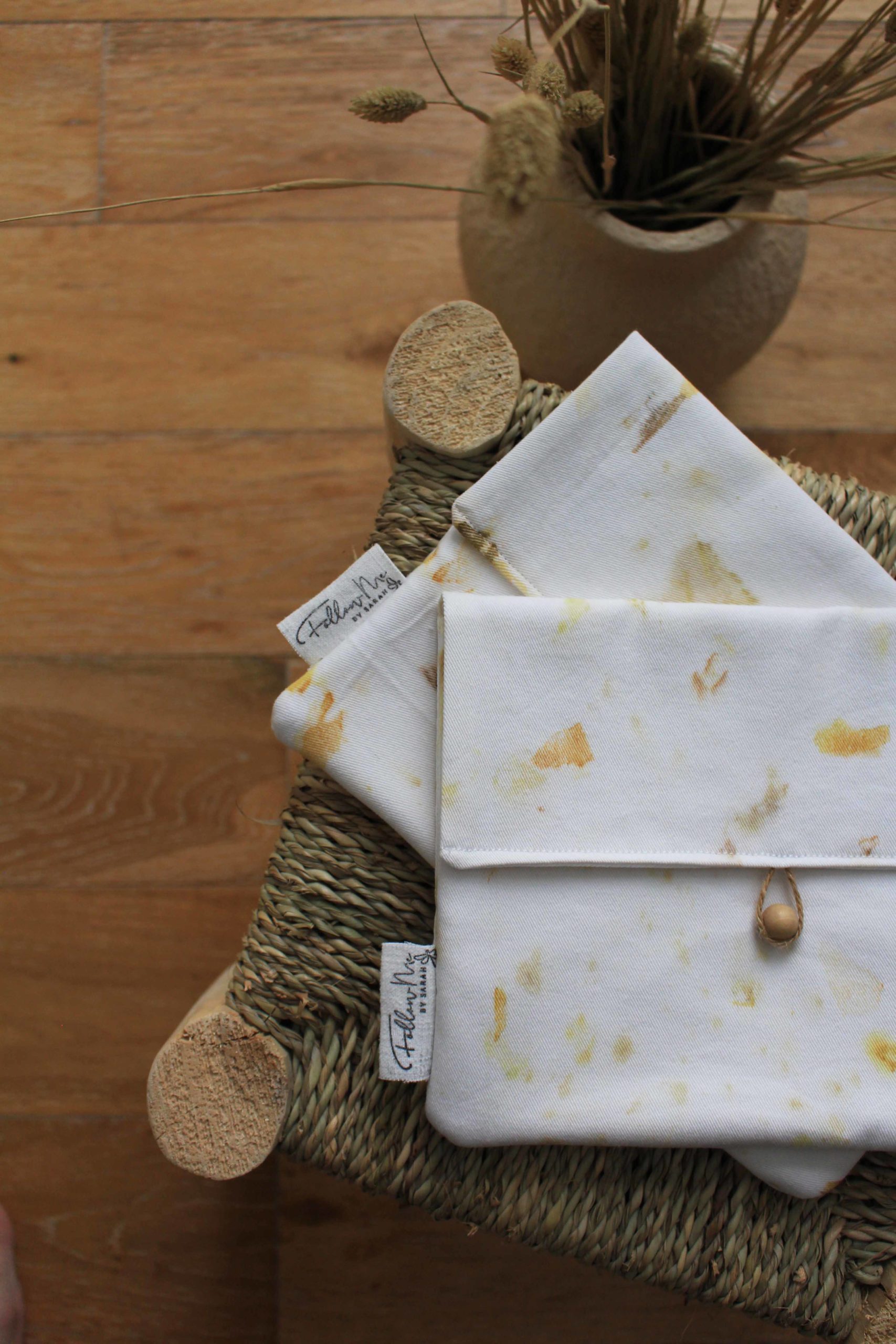 Laura s’inscrit dans une démarche d’upcycling où elle utilise notamment des textiles de seconde main pour réaliser ses boucles d’oreilles (80%). J’ai donc proposé à Laura de valoriser mes chutes en teinture végétale afin de co-créer des boucles d’oreilles uniques. Les perles en bois ont été, elles aussi, teintes de manière naturelle.