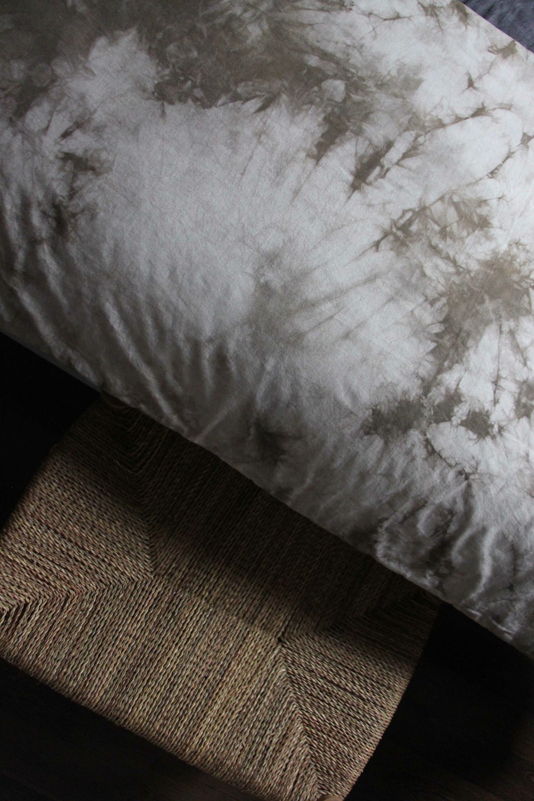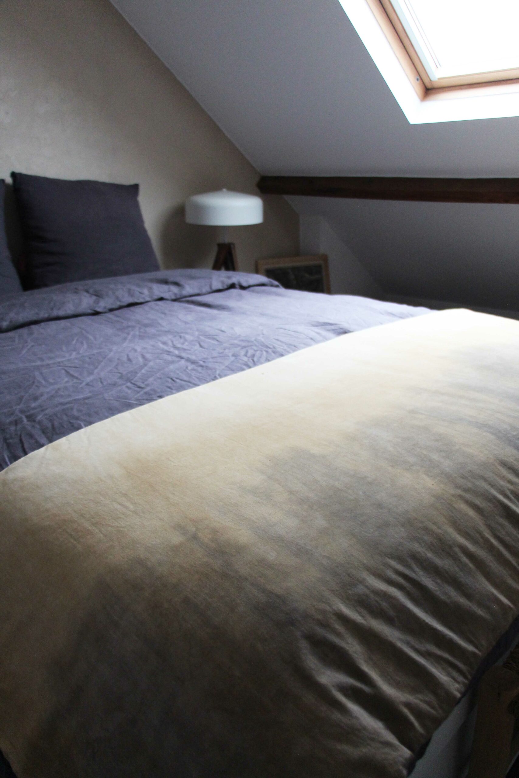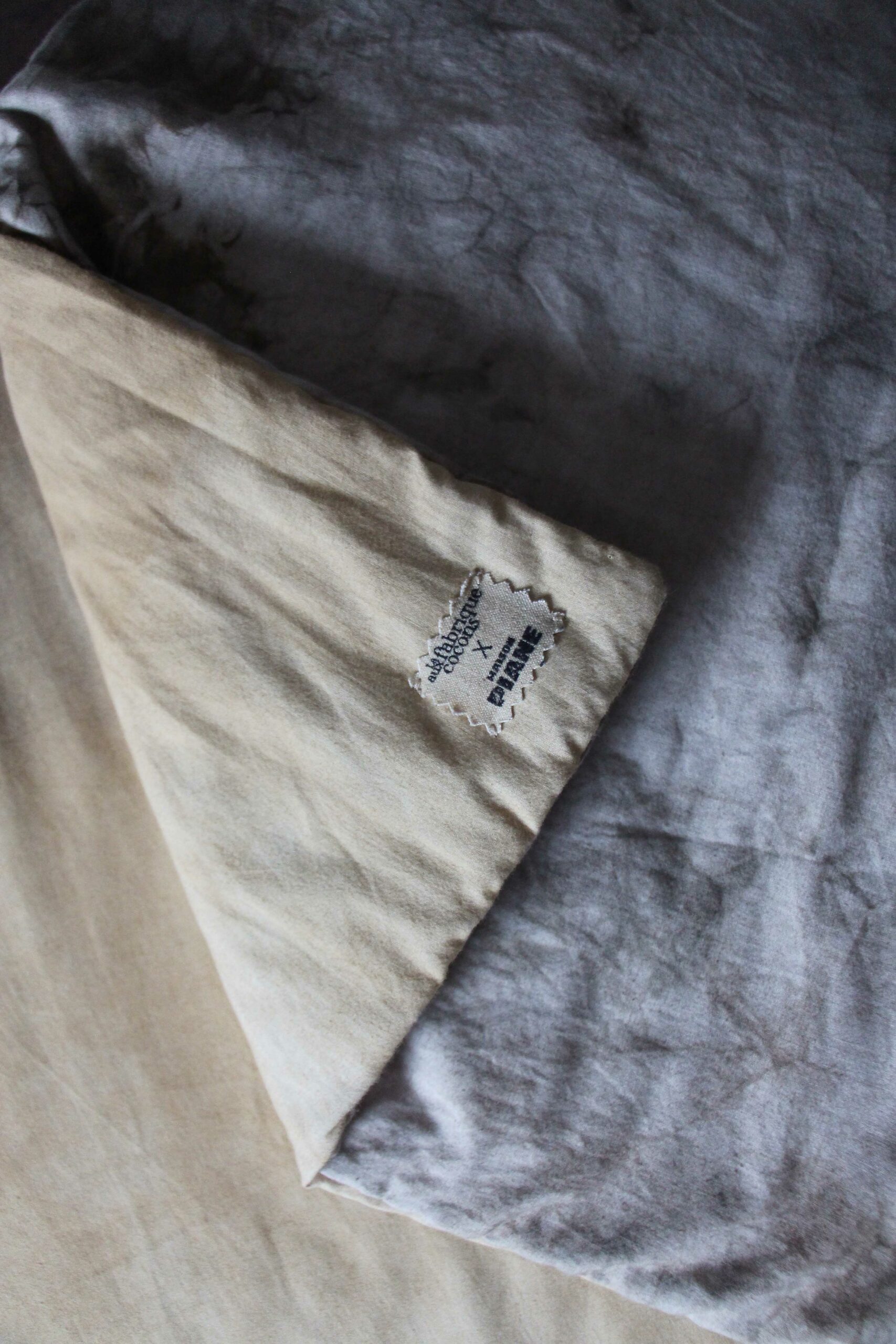 Sur le recto cet édredon a été teint en shibori à partir d’écorces de châtaignier puis nuancé à l’acétate de fer.