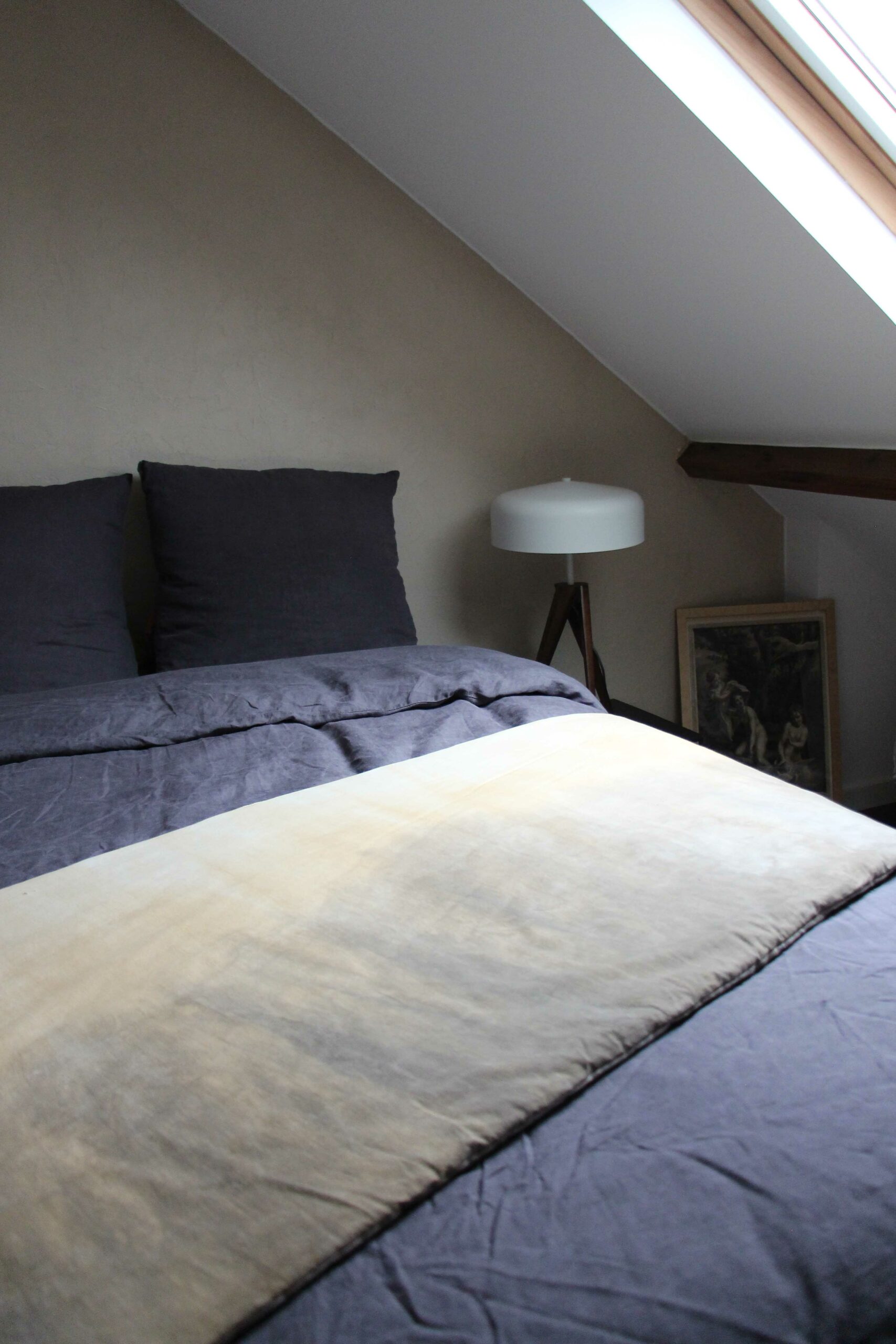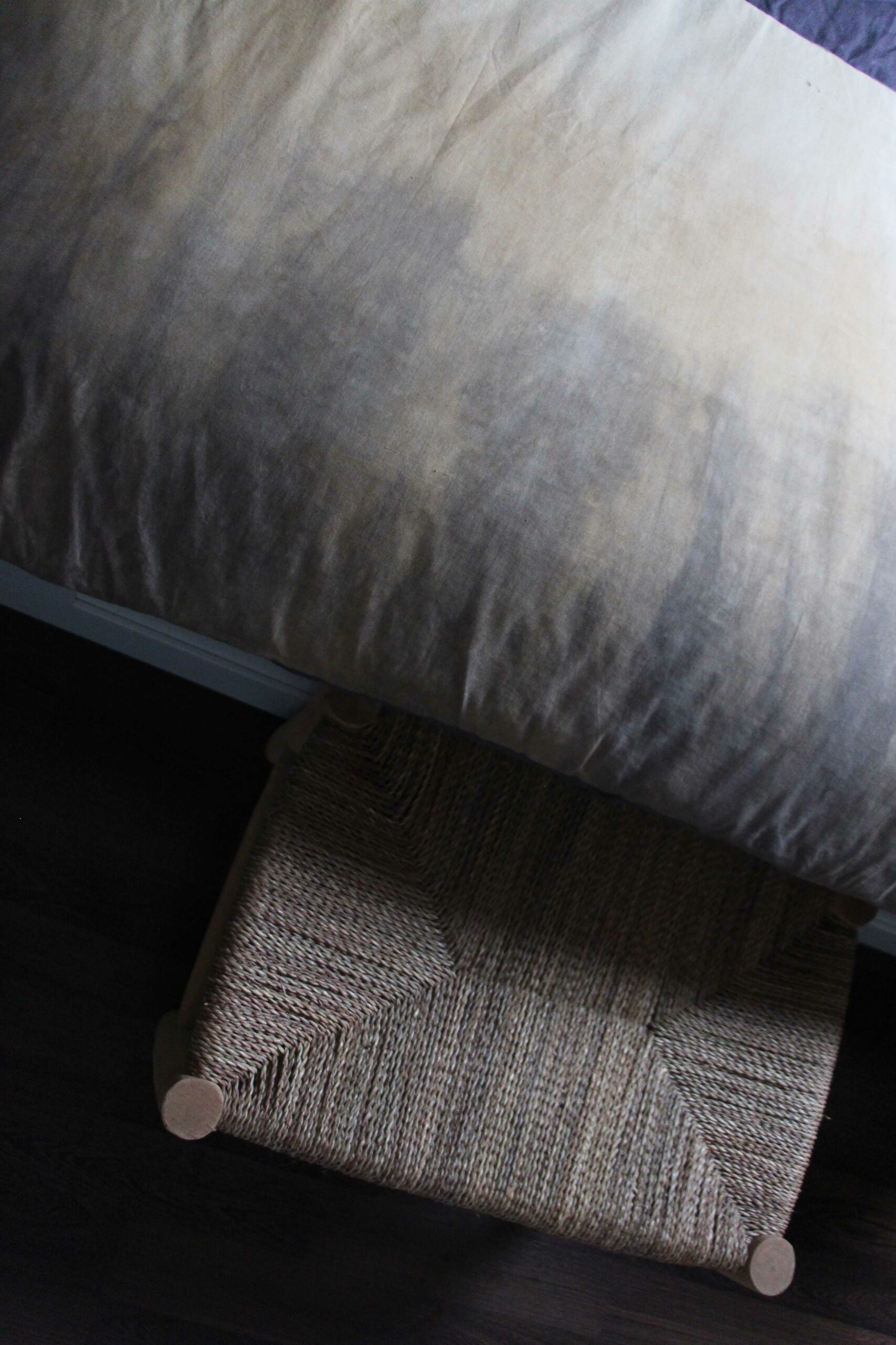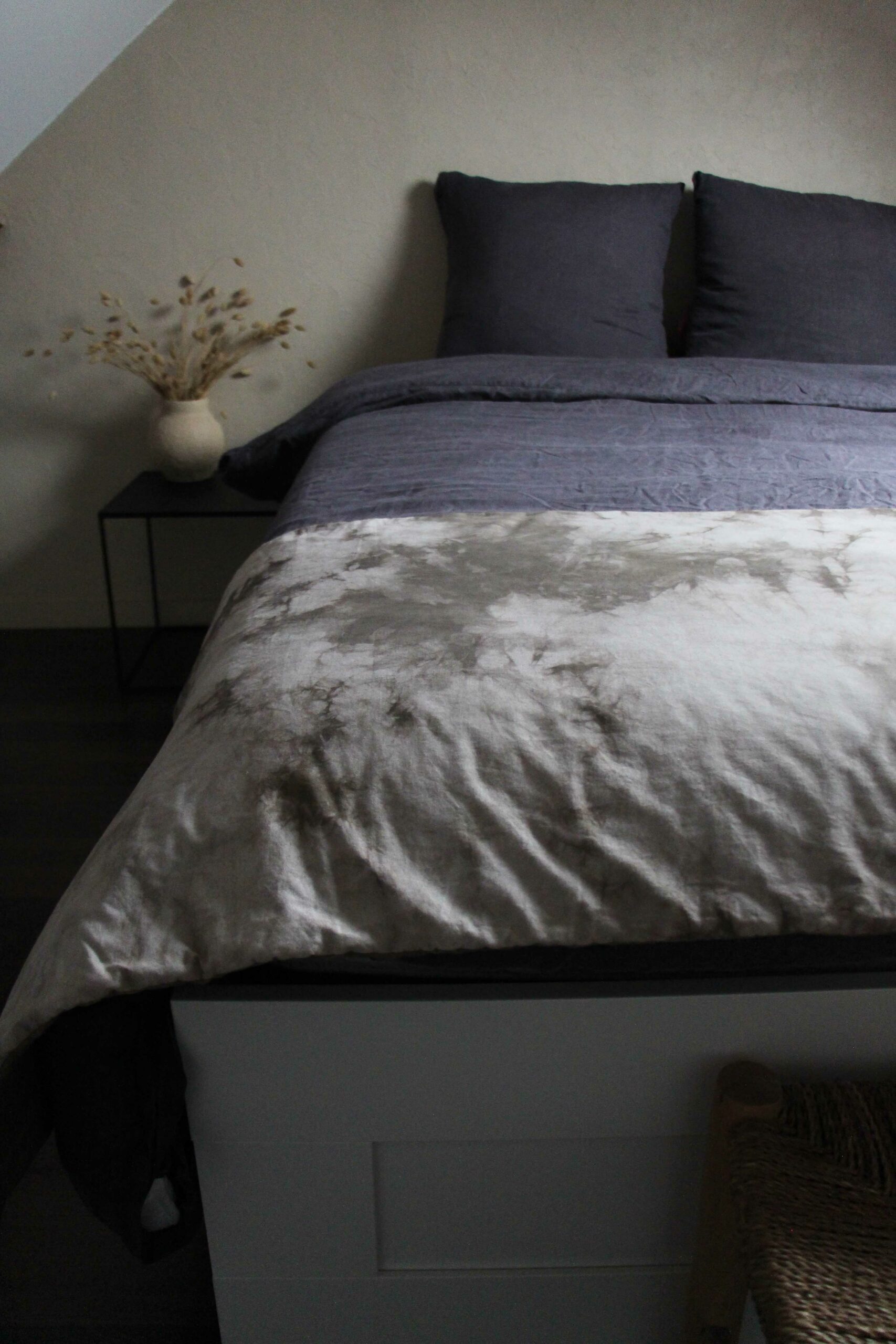 Sur le recto cet édredon a été teint en shibori à partir d’écorces de châtaignier puis nuancé à l’acétate de fer.