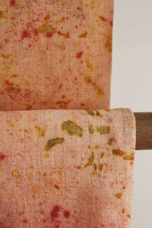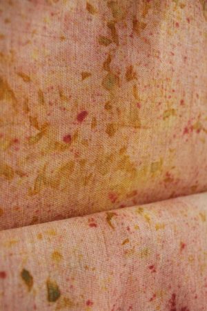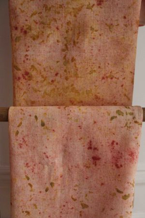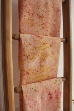 Foulard en gaze de coton teint de manière naturelle avec des extraits de racines de garance, des pétales d’oeillets d’Inde, des écorces de bourdaine et du réséda.