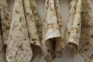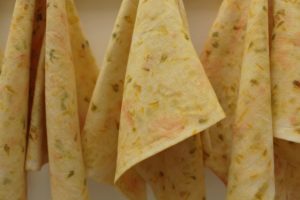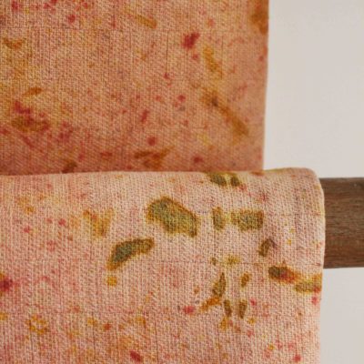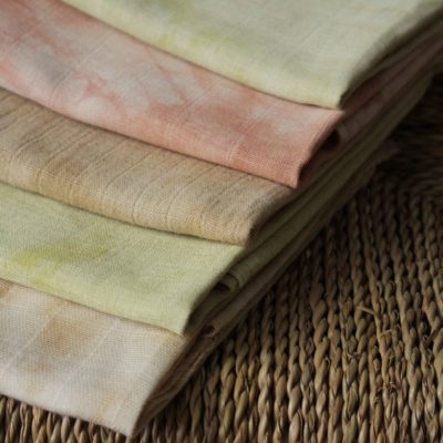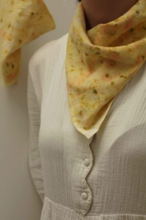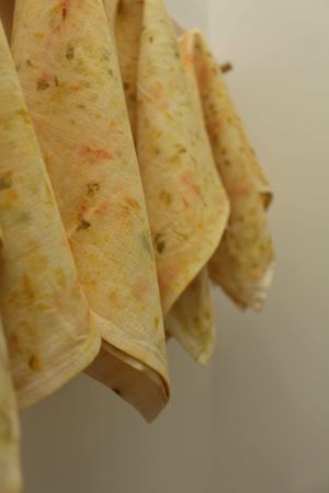 #01 : Foulard en lin teint naturellement avec des fleurs de cosmos, du réséda et des oeillets d’Inde.