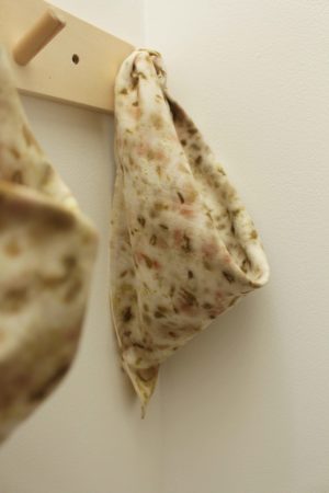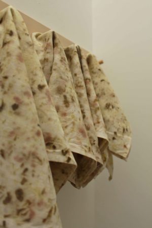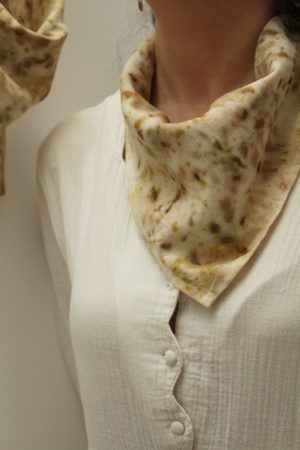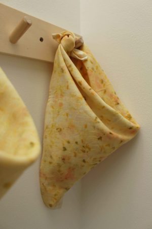 #02: Foulard en lin teint naturellement avec des fleurs de cosmos, du réséda et des oeillets d’Inde et oxydé avec du fer.