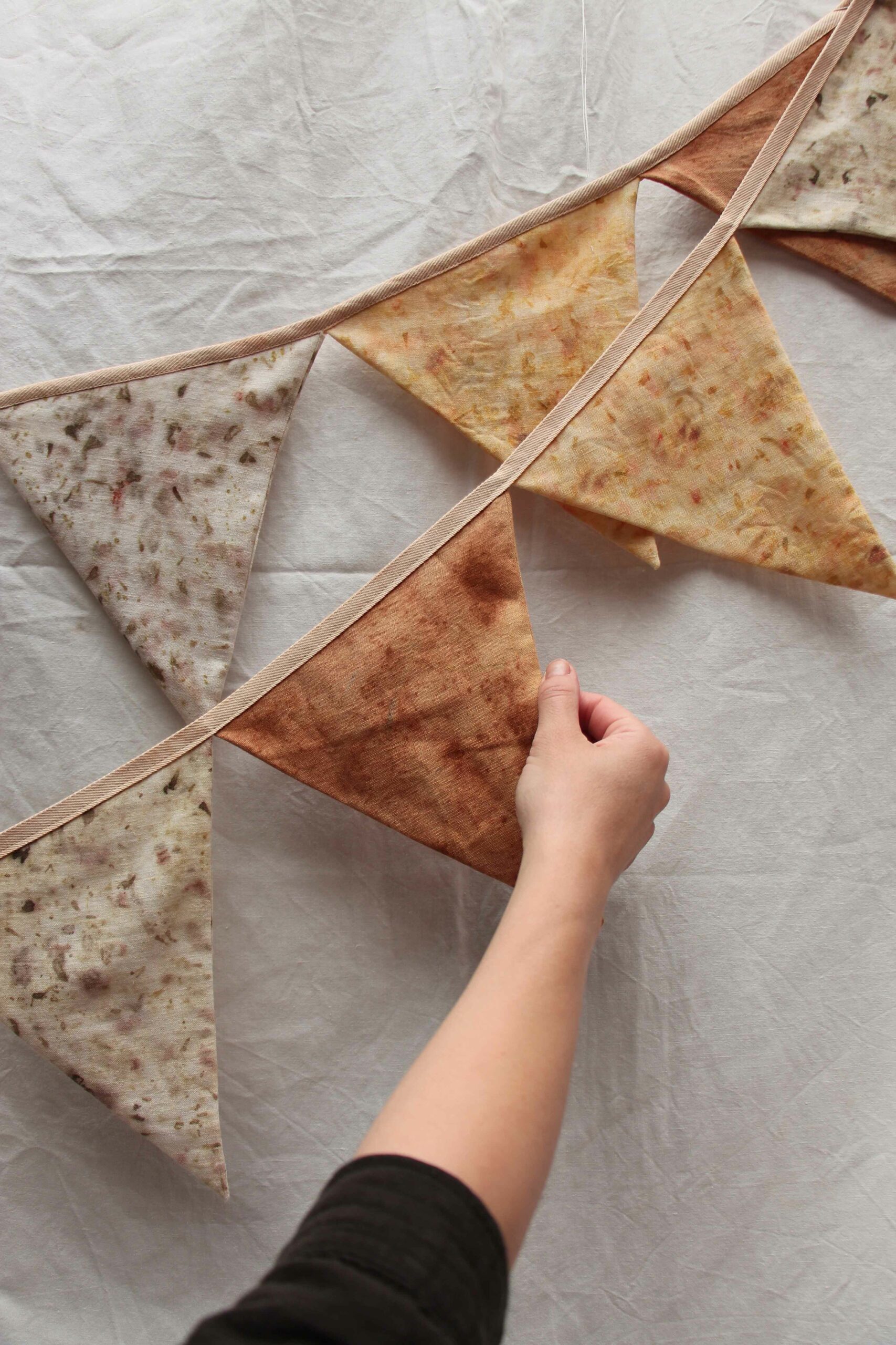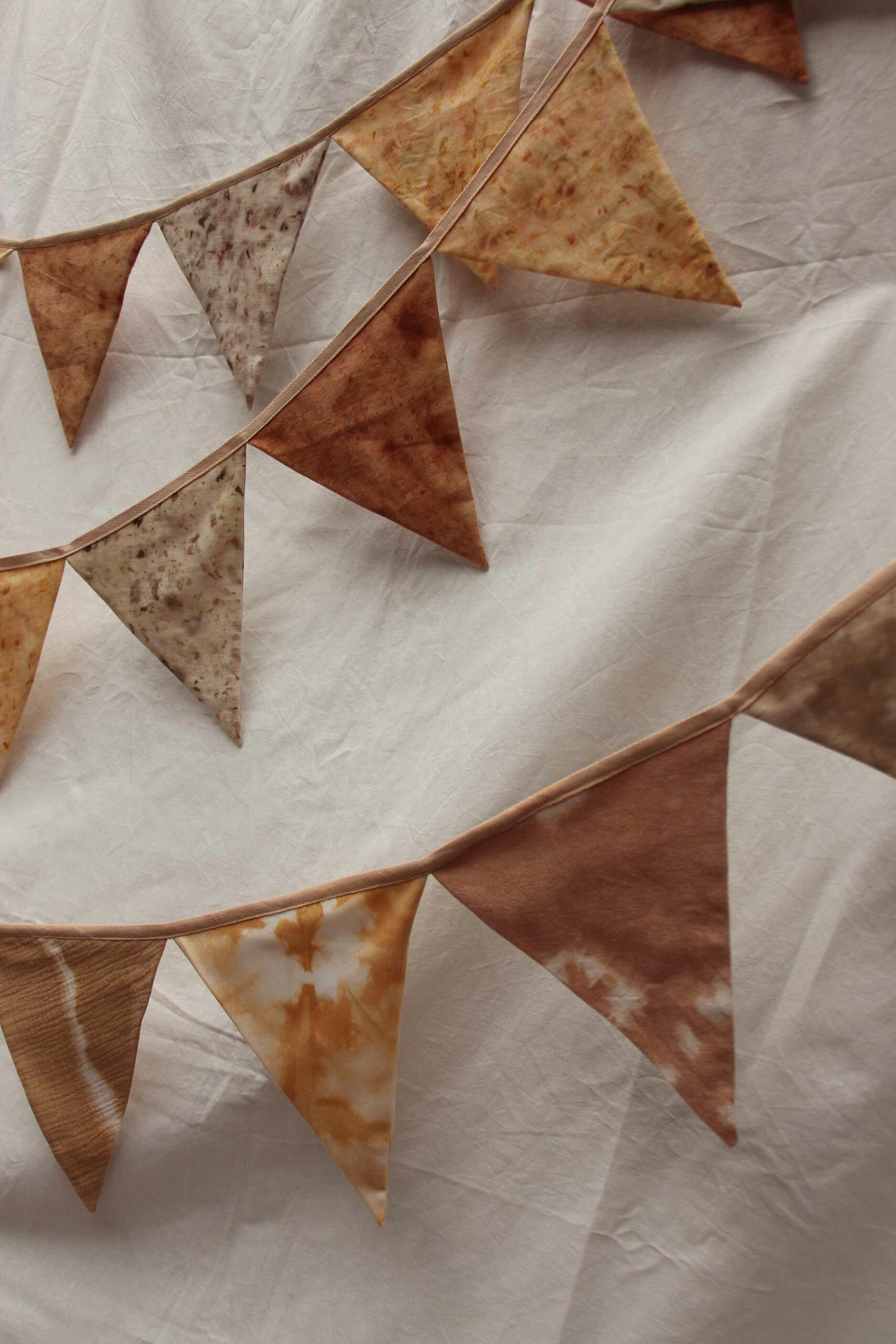 Confectionnée à la main à partir de coton et de lin teints naturellement avec des plantes, cette guirlande de fanions apportera charme et authenticité à votre décoration.